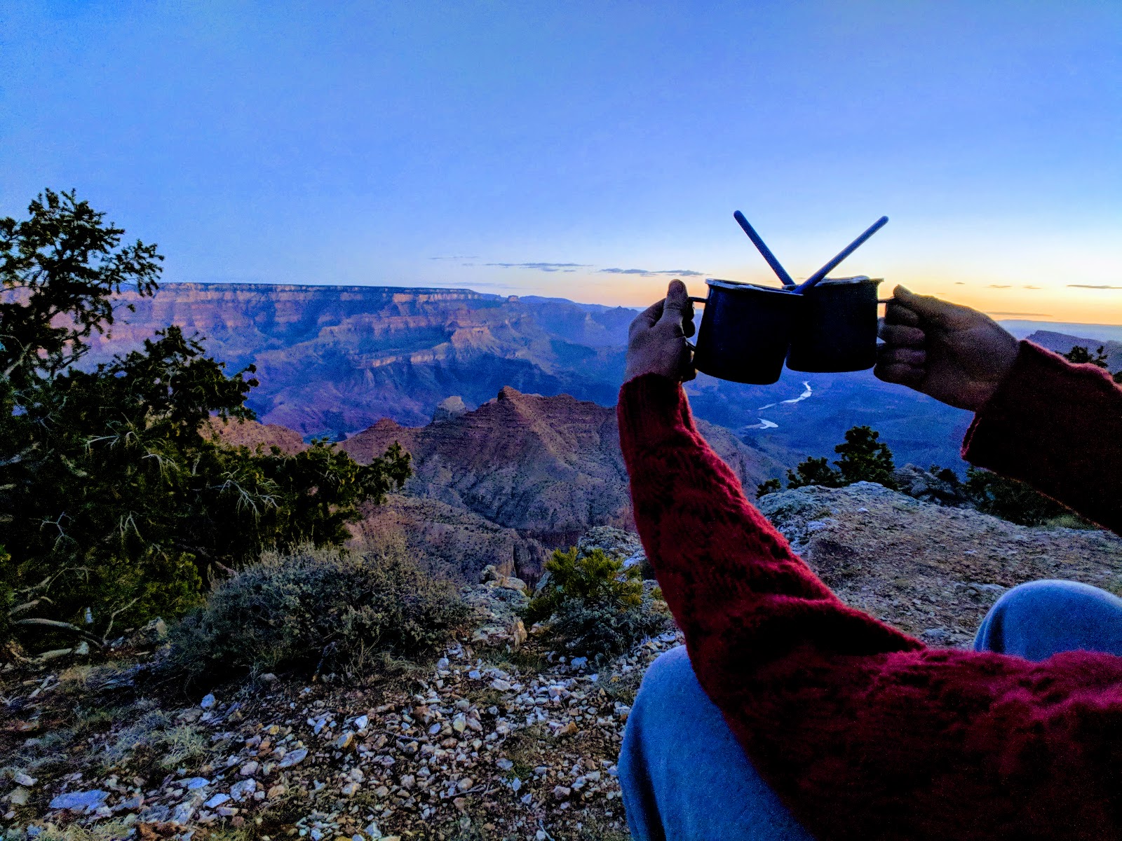Around 4 o'clock in the morning light started filtering in and we decided to get up and make some hot coco to watch the sunrise. Turns out we we're parked right on the rim and the void in front of us was indeed grand: